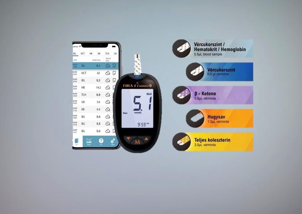 FORA 6 multifunkciós diagnosztikai mérőkészülék egy korszerű, többparaméteres egészségügyi mérőrendszer, amely lehetővé teszi több fontos laborérték gyors és pontos meghatározását otthoni használat vagy egészségügyi környezet számára. A készülék különböző FORA tesztcsíkokkal kompatibilis, így rugalmas és költséghatékony megoldást kínál a rendszeres ellenőrzéshez.